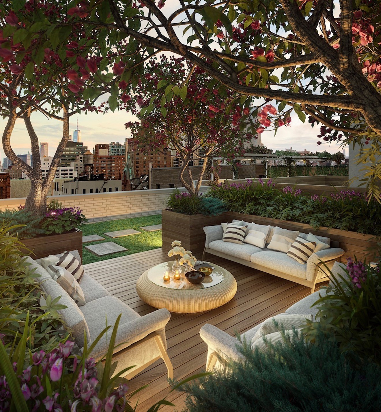 At the heart of Gramercy Square is a 20,000-square-foot private outdoor oasis featuring a central courtyard, walking paths, and a rooftop terrace with an outdoor kitchen and lounge areas, and lush landscaping with annuals, perennials, and diverse tree species.