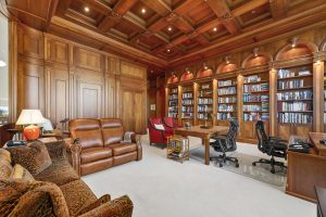 “The House of Peace” is one of the most majestic and thoughtfully rendered properties in all of South Florida. The executive office features magnifying ceilings with a lounge seating area, towering wood bookcases and two executive style wood desks.