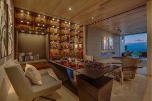 A fully-furnished brand new Architectural Masterpiece by Doug Burdge (AIA), VILLA SPLENDIDO is perched high on the hillside where land meets sea, above the highly sought-after “Billionaire’s Beach”. Tucked away in a private corner of this masterfully-crafted estate, the “James Bond” inspired office offers a balanced blend of well-appointed furnishings and optimal functionality with hallmarks that include an incredible ocean view and fully-stocked vanishing Lift Krion Bar (Roche Bobois Paris). Additional features of this tailored enclave include an ultra-modern, Furtif Desk (Roche Bobois Paris), wall-mounted flat screen television, oversized sliding Fleetwood Glass Door and a selection of native fossils and artifacts found during construction.