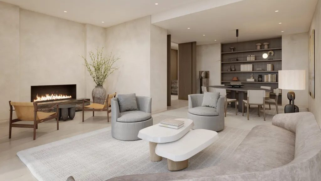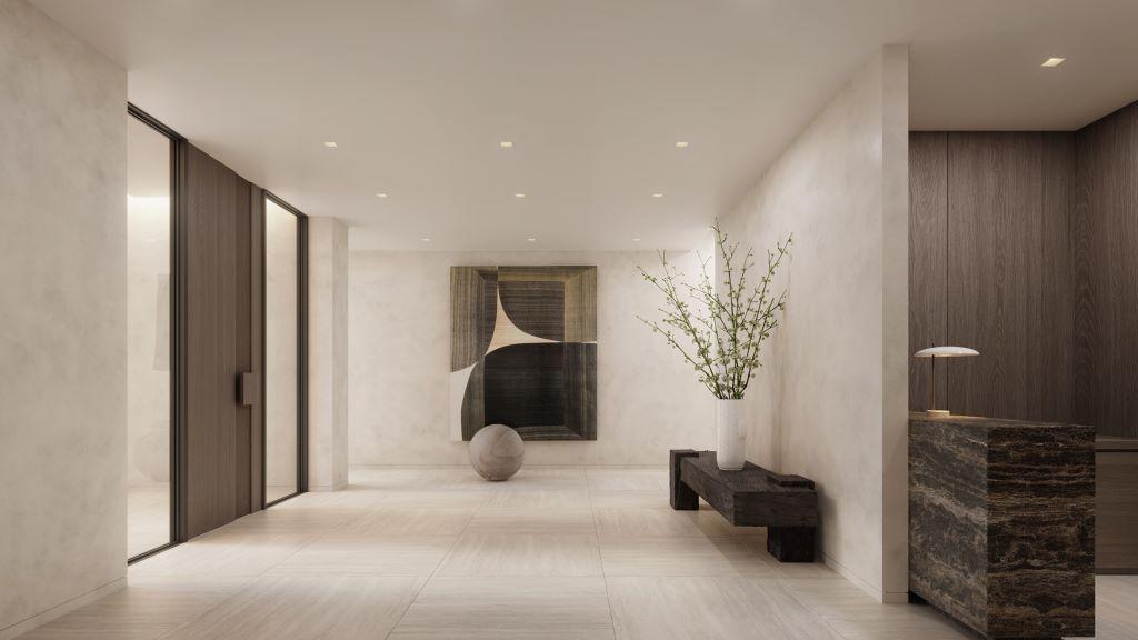The interiors showcase organic and neutral color palettes, floor-to-ceiling windows, generous open-concept layouts for flexible living and elegant touches throughout. Each floor of the building comprises two residences, while the penthouse unit occupies the entire top level.