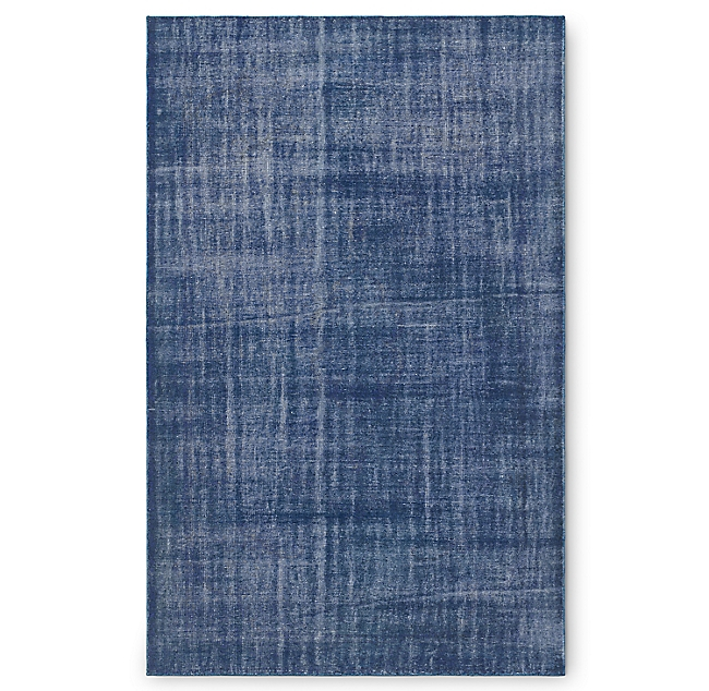 Made with thick yarns, overdyed in a sold blue tone, then washed and distressed, the random shading in this rug is like that of an antique carpet.