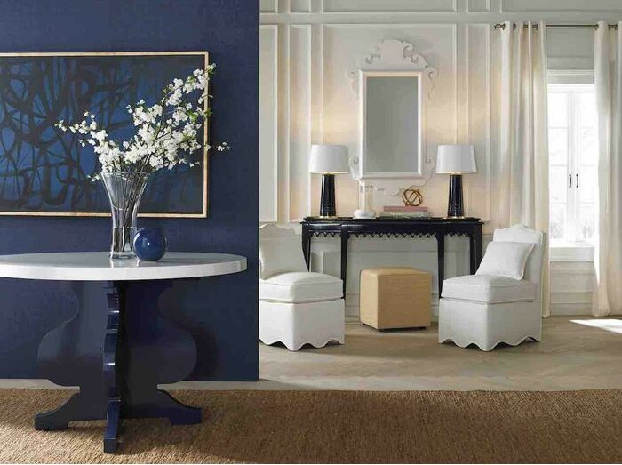 With its elegant and dramatically curved base in a Classic Blue hue, this show-stopping table is as versatile in an entryway styled with flowers and books as it is as a dining table.