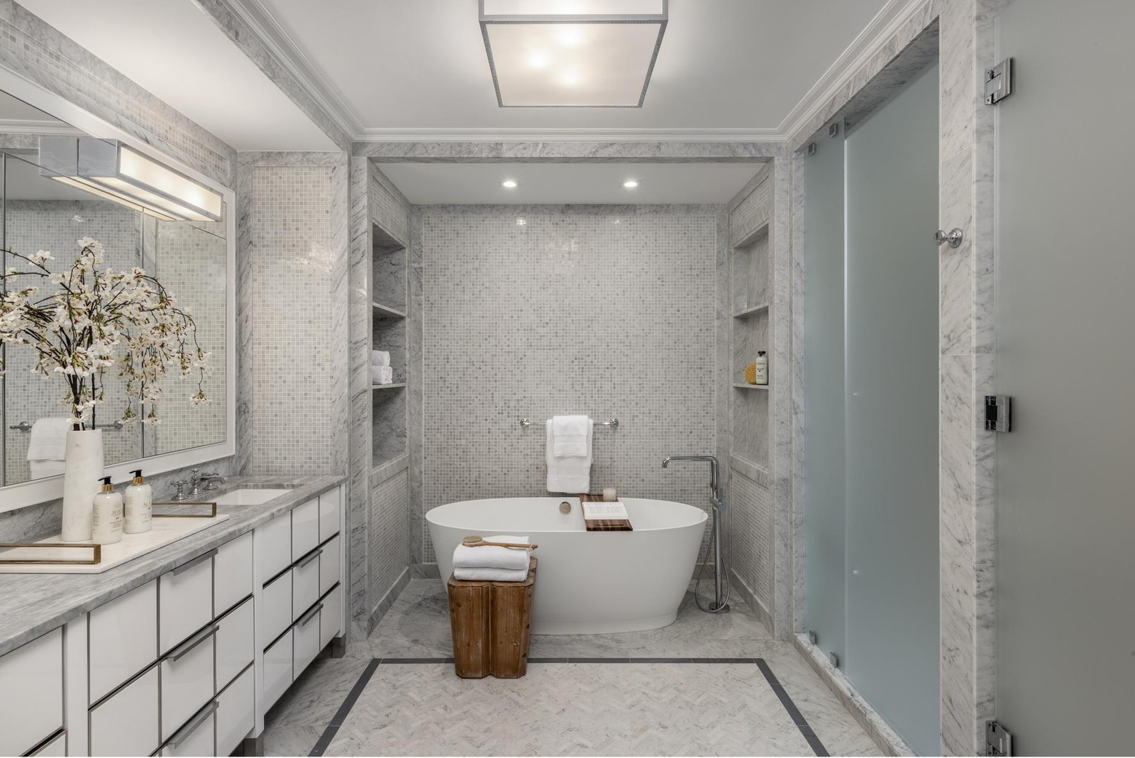 The available units range from 1,042 to 4,038 square feet in size with one to five bedrooms. Features include stunning white oak herringbone floors, open kitchens with designer appliances and custom millwork, and spa-inspired primary bathrooms with marble countertops and designer fixtures throughout. Pricing during phase one of sales starts at $1.85 million and goes up to $8.35 million, with both penthouses and townhomes to be released in an upcoming second phase.