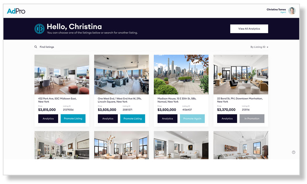 AdPro’s propriety AI models track lookalike high-intent audiences, as well as engagement with similar listings and related interests, in order to target likely buyers in the market for real estate. Agents can select from a menu of packages preset with finely tuned targeting and optimal duration to maximize the impact of a promoted listing.
