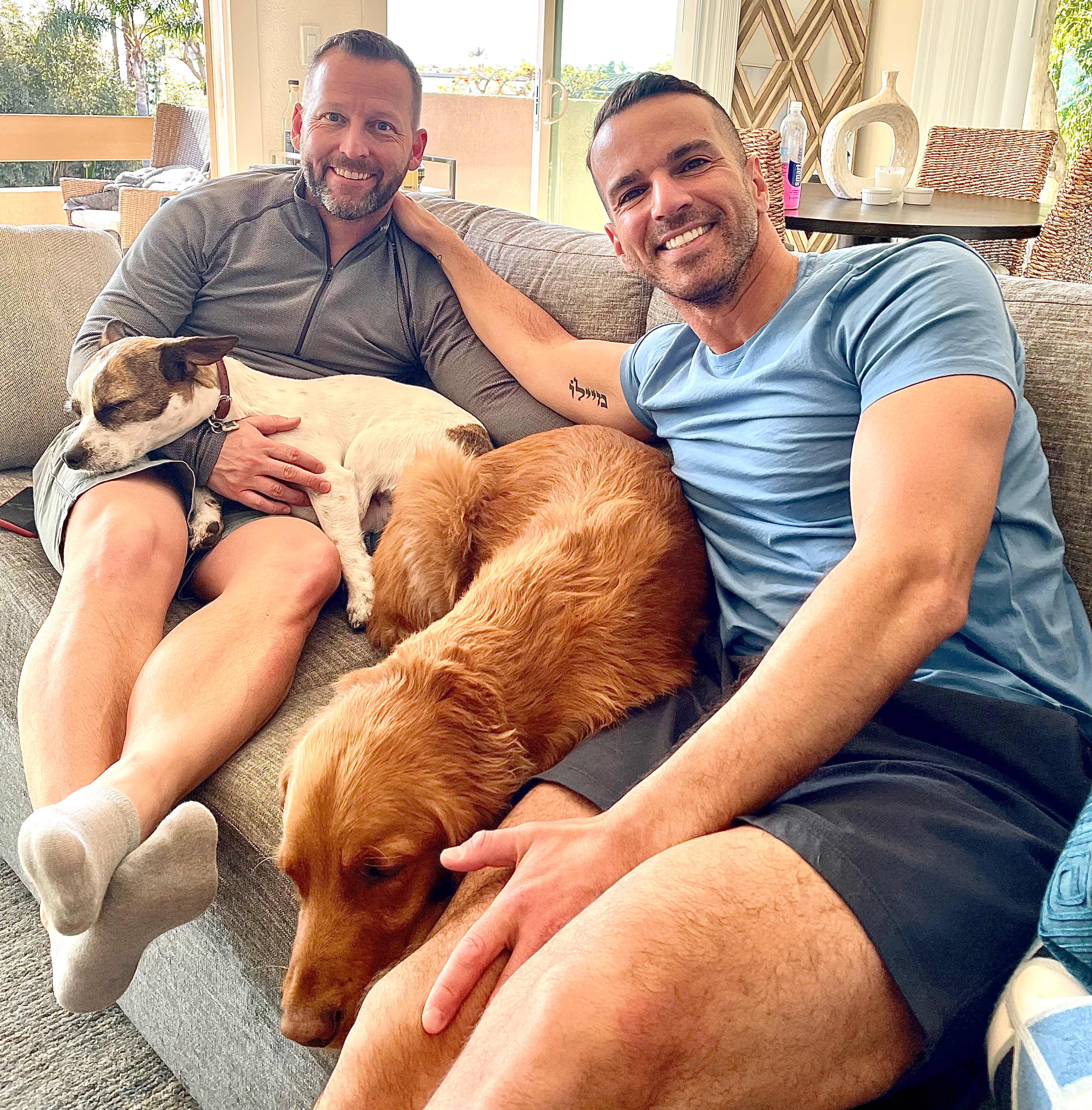 Avi with his husband, Tom, and their dogs, Hank and Milo. Avi and his husband, Tom. Avi with his terrier, Hank. Avi with his terrier, Hank.