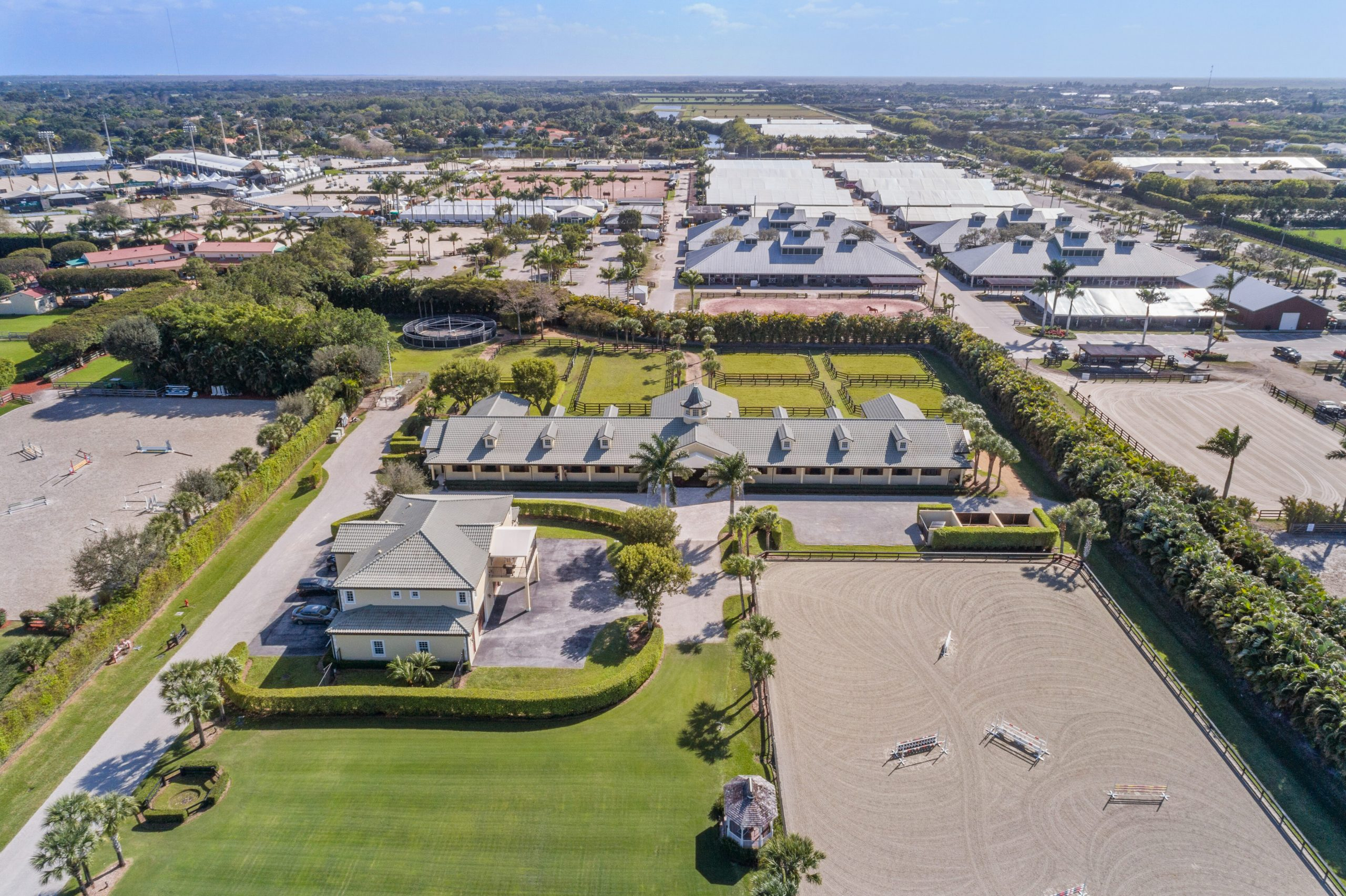 Also in Wellington, this incredible 14-acre equestrian farm feels like it was plucked out of the Italian countryside and transported to Florida. Stunning landscaping, brick pathways, and water features define this property, while an onsite pond and additional water frontage provide a calming atmosphere. Built in 2001, this is the first time that the farm is available for sale, and it’s one of the largest in Grand Prix Village. Three gated entrances, outdoor riding facilities, commercial laundry, 20 matted Loddon stalls are included. Living quarters offer stunning views of the surrounding grounds. Plus, the Olde Hampton Drive property is a short drive from Palm Beach International Equestrian Center. Maria Mendelsohn represents the listing.