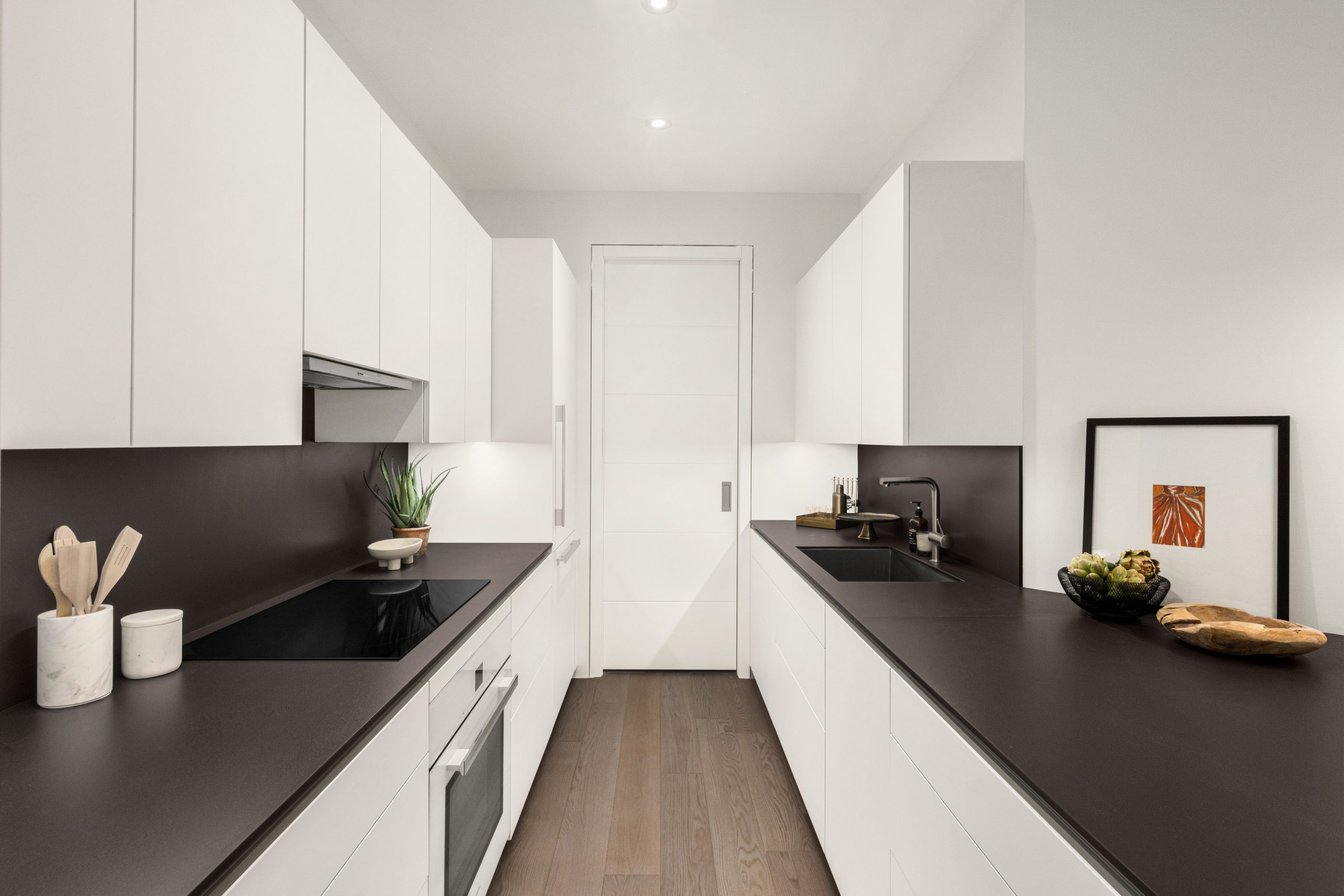 The all-white, open-island Poggenpohl kitchens feature sleek black Dekton countertops and backsplashes and top-of-the-line Miele appliances, including convection oven, induction cooktop, vented hooded ranges, dishwasher and refrigeration systems. Each residence includes a laundry room.