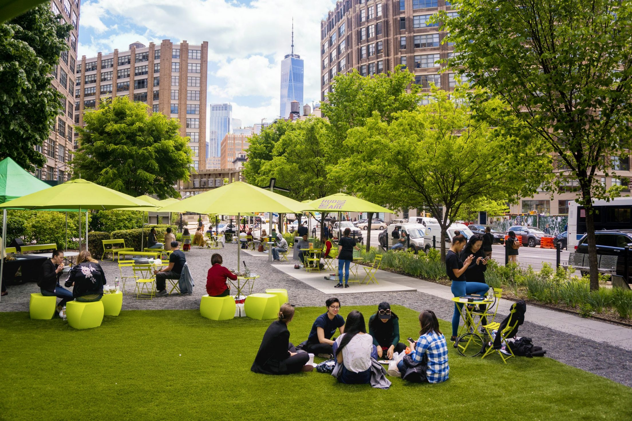In addition to tree- lined paths and a wooden deck, Pier 62 has a carousel and a skate park to appeal to young visitors. (PHOTO: COURTESY HUDSON RIVER PARK TRUST) Little Island is built over the Hudson River on a cluster of tulip-shaped pillars. (Photo: Ryan RahmanPacific Press via ZUMA Press Wire) Jaunty lime-green umbrellas and matching seating brighten Freeman Plaza West, a public park in Hudson Square.